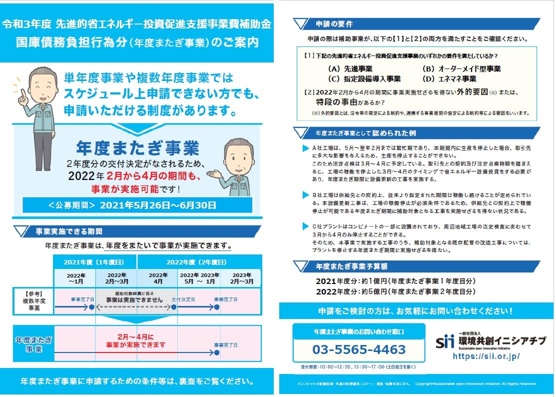 令和3年度「先進的省エネルギー投資促進支援事業費補助金」国庫債務負担行為分(年度またぎ事業)の概要は、以下のパンフレットをご確認ください。