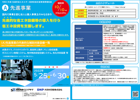 令和4年度「先進的省エネルギー投資促進支援事業費補助金」(A)先進事業の事業要件等は、以下のパンフレットをご確認ください。