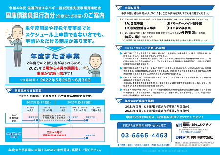 令和4年度「先進的省エネルギー投資促進支援事業費補助金」国庫債務負担行為分(年度またぎ事業)の概要は、以下のパンフレットをご確認ください。