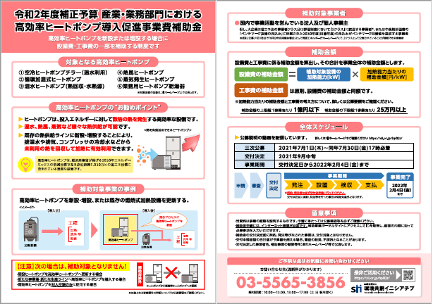 令和2年度補正予算「産業・業務部門における高効率ヒートポンプ導入促進事業費補助金」の概要は、以下のパンフレットをご確認ください。