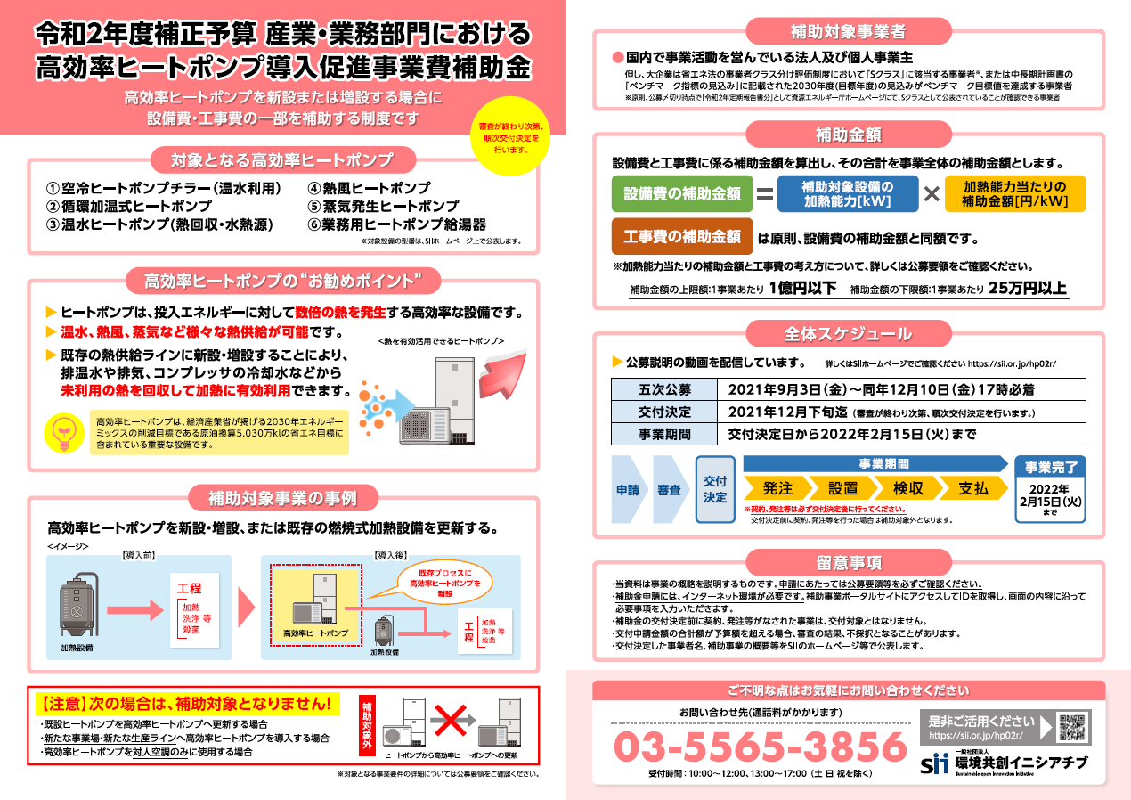 令和2年度補正予算「産業・業務部門における高効率ヒートポンプ導入促進事業費補助金」の概要は、以下のパンフレットをご確認ください。