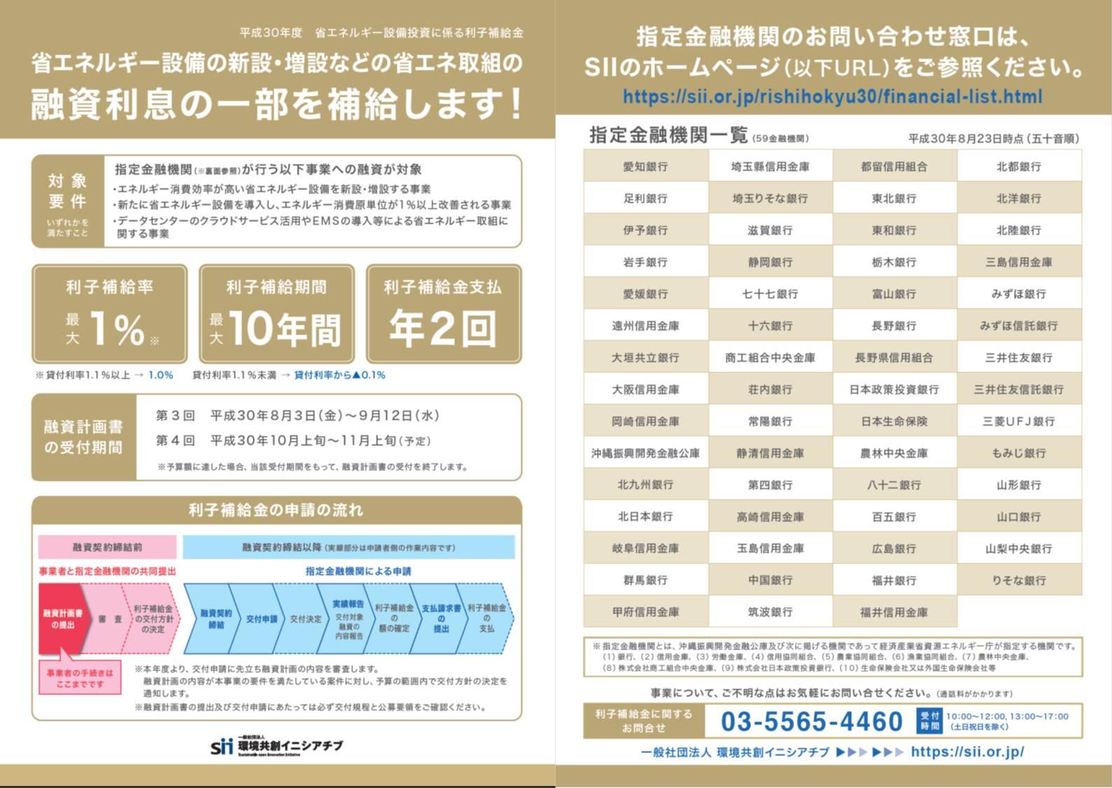 平成30年度「省エネルギー設備投資に係る利子補給金」の概要は以下のパンフレットをご確認ください。